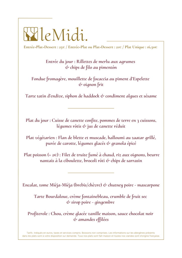 A choice of 3 starters, 3 dishes, 2 desserts changing from day to day.