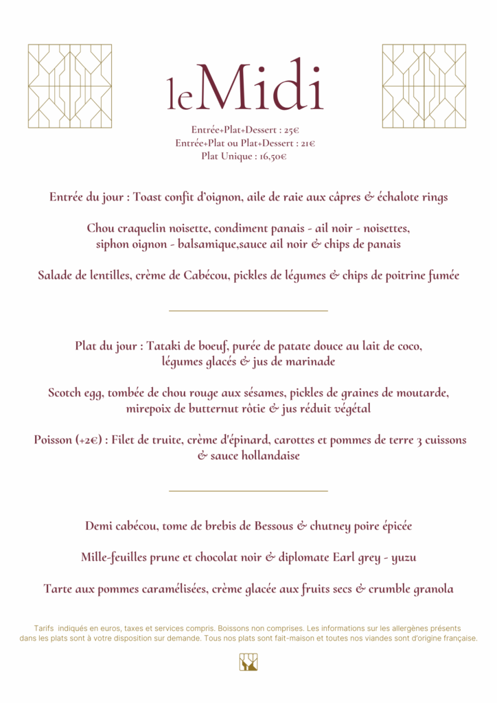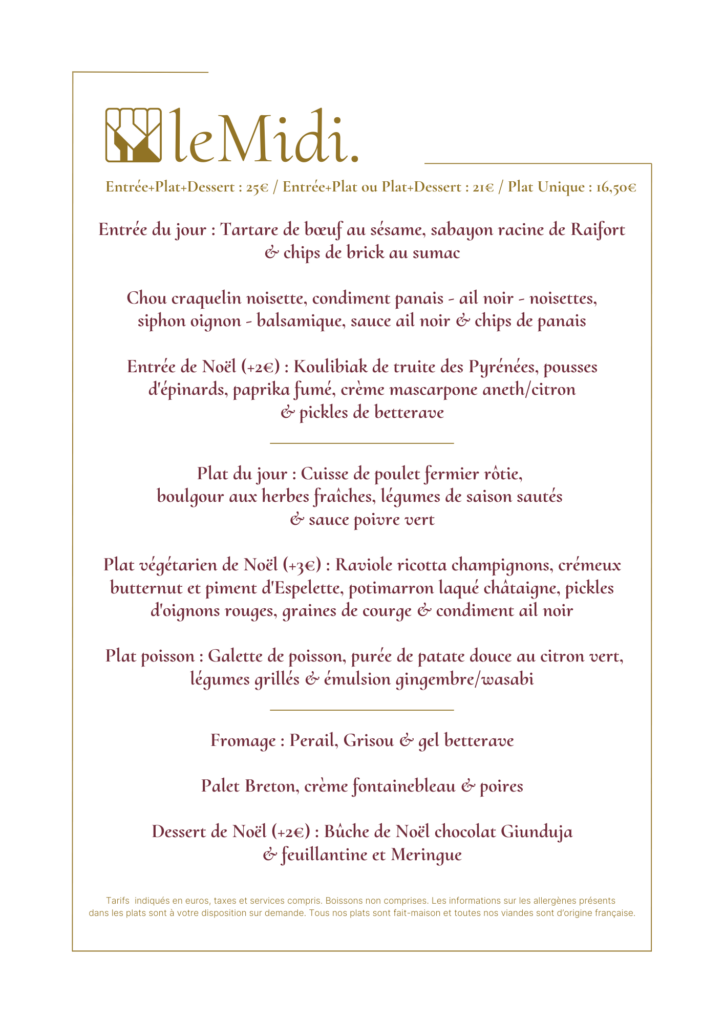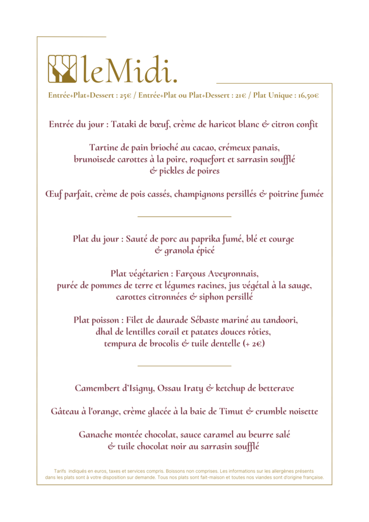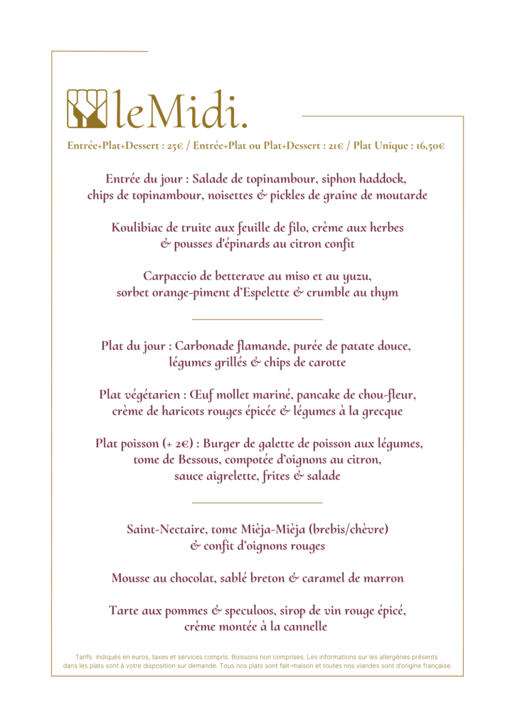 Le midi nous proposons une carte courte inspirée par nos arrivages. Un choix de 3 entrées, 3 plats, 2 desserts changeant de jours en jours.